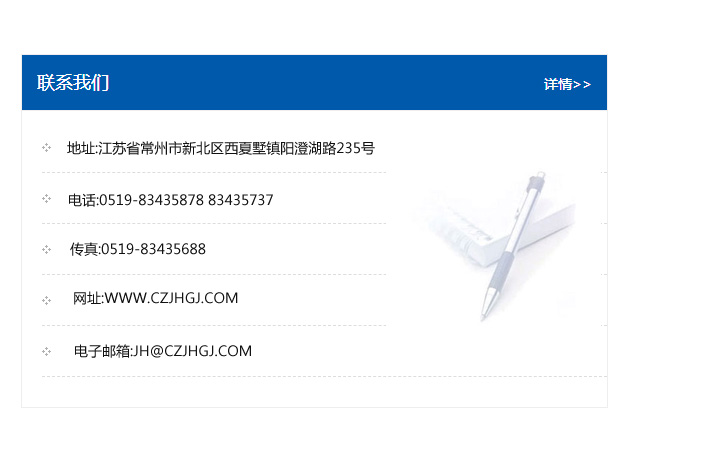 地址:常州市新北區友邦商務大廈1幢16、17層  電話:0519-85101652  傳真:0519-85112595  郵編:213022  網址:www.cz-jiayue_cn.jiexianduanzitai.com  郵箱:xiajifengaa@163.com